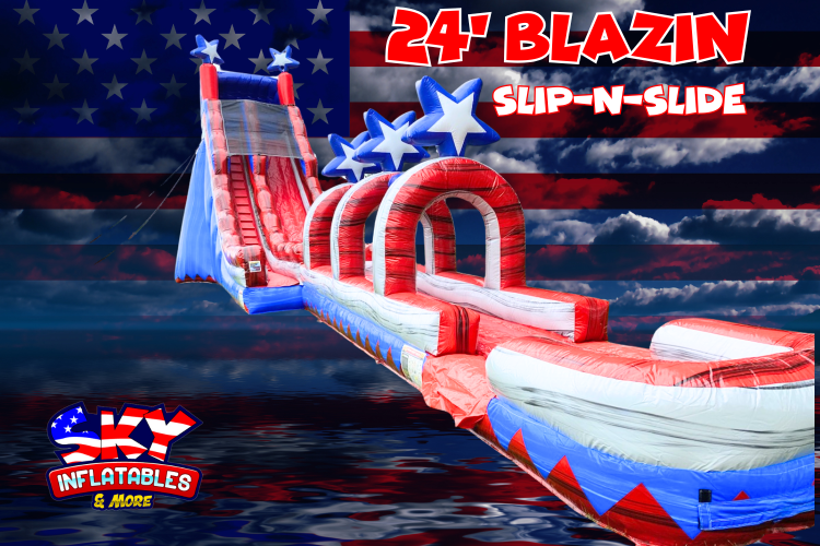 Get ready for a splash of excitement with the 24' Blazin Water Slide! This towering inflatable is perfect for summer parties, offering a thrilling ride from top to bottom. With its Patriotic colors and impressive height, it's sure to turn any event into a fun-filled adventure. Dive in, cool off, and let the good times roll!