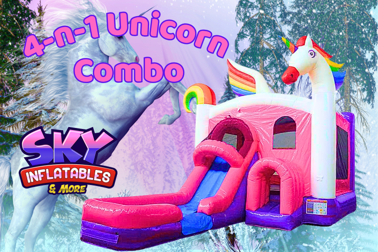 Step into a world of enchantment with the 4in1 Unicorn Combo (Dry). This magical bouncy kingdom offers not just a place to jump, but also a slide, rock-climbing wall, and basketball hoop—all wrapped up in a whimsical unicorn theme. Perfect for parties, this combo unit brings fun and fantasy together, letting imaginations run wild while kids enjoy a range of activities in one enchanting setup. Fun has never been this fantastical!